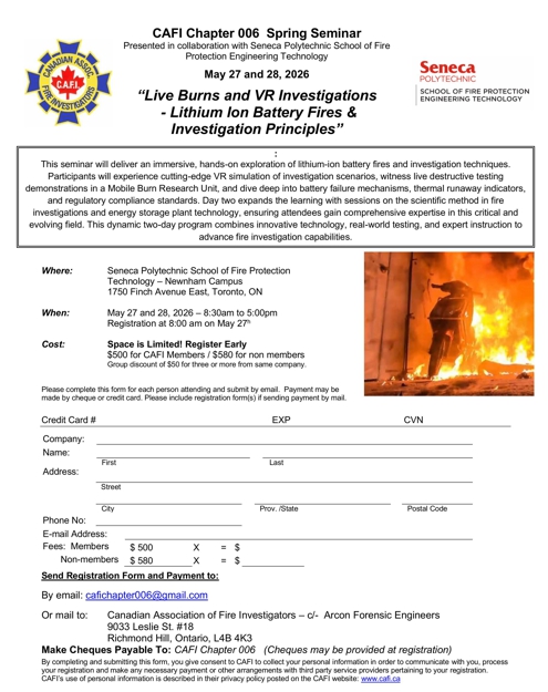 Presented in collaboration with Seneca Polytechnic School of Fire Protection Engineering Technology, this seminar will deliver an immersive, hands-on exploration of lithium-ion battery fires and investigation techniques. Participants will experience cutting-edge VR simulation of investigation scenarios, witness live destructive testing demonstrations in a Mobile Burn Research Unit, and dive deep into battery failure mechanisms, thermal runaway indicators, and regulatory compliance standards. Day two expands the learning with sessions on the scientific method in fire investigations and energy storage plant technology, ensuring attendees gain comprehensive expertise in this critical and evolving field. This dynamic two-day program combines innovative technology, real-world testing, and expert instruction to advance fire investigation capabilities.